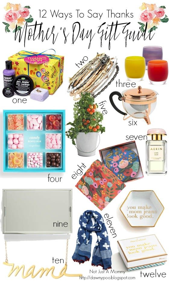 one. full-body indulgence wrapped in recycled handmade paper from LUSHย ย | two. set of 12 bangles from Kendra Scottย | three. votive glass candleholders from ย glassybabyย ย | four.ย Sugarfina‘sย Sweetest Mom Bento Box is two layers of sweet love in lucite boxesย |ย five. grow your favorite veggies in Potting Shed Creations’ Garden-In-A-Pail.ย ย | six. Brew tea in style in ย World Market‘s copper bodum infuser teapot with glass carafe.ย | seven. AERIN Beauty ‘Lilac Path’ Eau de Parfum Spray fromย Nordstromย | eight.ย Rifle Paper Co.’s‘ย ย Assorted Floral coasters | nine. serve her breakfast in bed onย West Elm’sย mirror trayย | ten. MAMA necklace fromย Brevityย |ย eleven. Chorus Pom Pom scarf fromย Moorea Sealย | twelve. give her a compliment everyday with ย Rosanna, Inc.