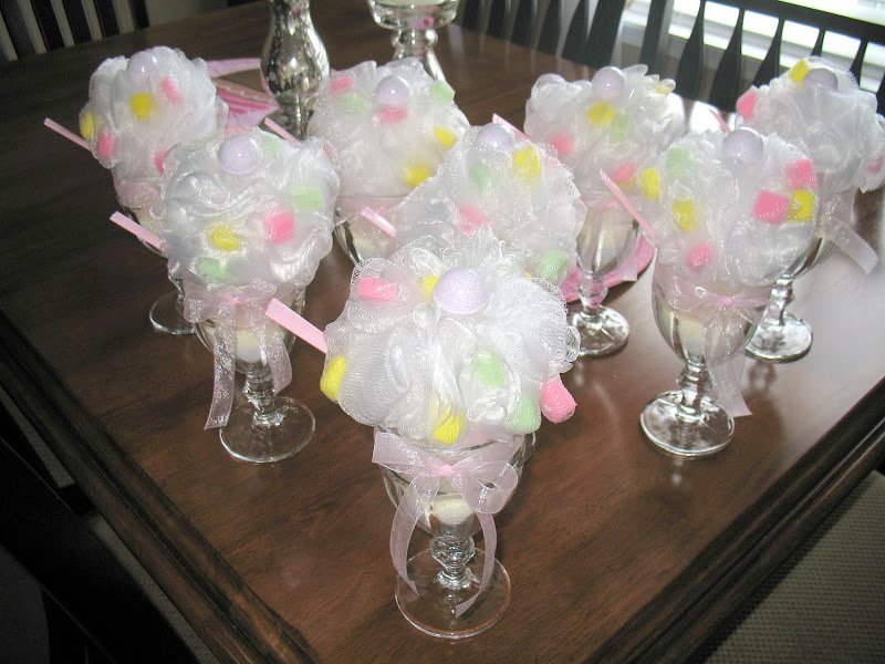 Check out our favors! To continue our pampering, we all received these ice-cream sundaes, and note her cleverness…she added a bath bomb ‘cherry’ to the loofah ‘ice cream’, and the glass is filled with bath beads. And yes, she does top it off with a real spoon. I know, your wheels are turning to make your own, right? They are perfect gifts to give your gals, and you can coordinate with your favorite colors to your heart’s content!
