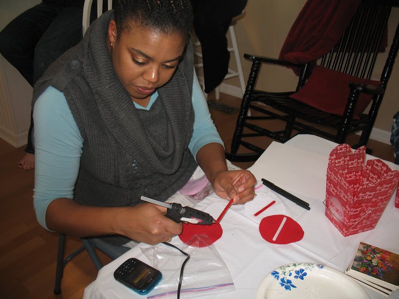Amidst chatting and tea sipping she had a craft for us. We made felt Valentine fortune cookies where instead of fortunes we wrote love coupons for our significant others. Here I am multitasking, reading texts and crafting!
