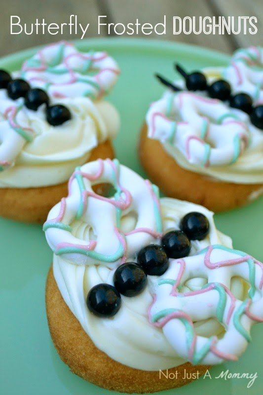 Turn them into fun butterfly frosted doughnuts by using black Sixlets for the body and yogurt covered pretzels for the wings. ย If you are feeling daring, you can use licorice rope for antennae. ย This will be fabulous for any spring celebration…because a cake stand of these will fly away.