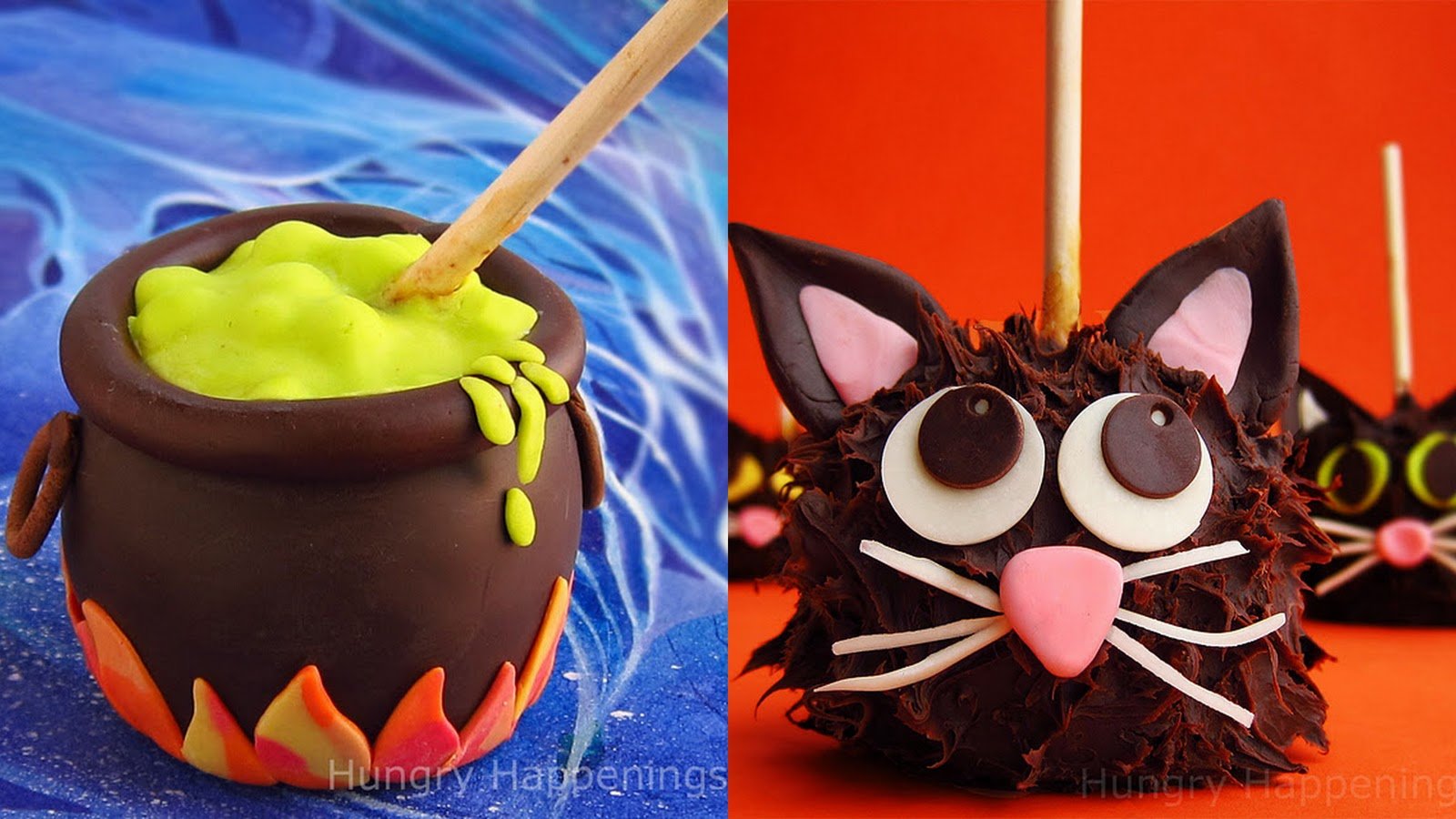 Hungry Happenings‘ chocolate caramel apple cauldron and cat are decorated with modeling chocolate!