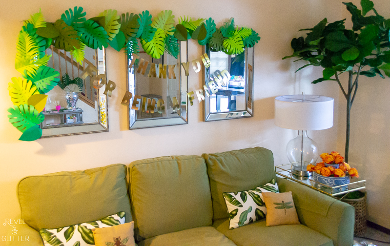 With this great set of various tropical leaves from Etsy shop Creativepartyworld, I adhered them to ribbon to create a garland, then finished the look with a gold cardstock letter banner. A few pillows (mine were an off-season score, find a similar one here), my existing fig leaf tree, and disco balls made everything come together.