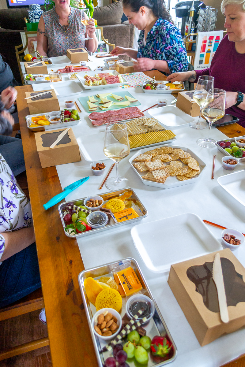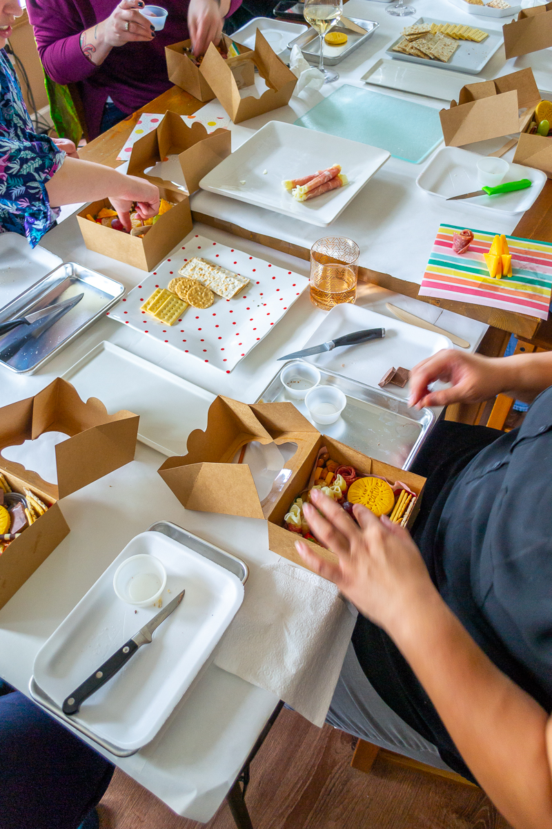 Then, after a few glasses and a few laughs, we moved to the charcuterie box-making part. The key to this party is having everything pre-portioned and simplified for everyone to feel comfortable enough to get creative.