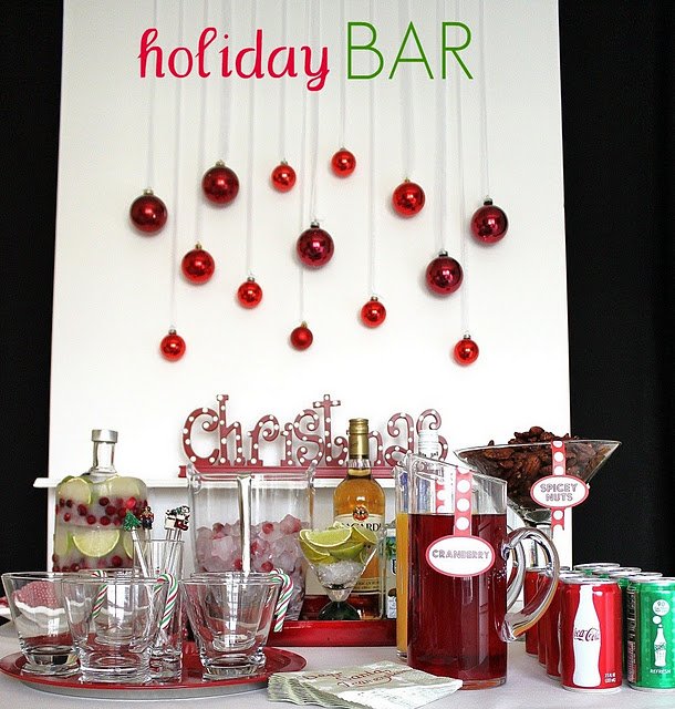 I love a good cocktail, and signature cocktails are my party staple. I love having guests become Tom Cruise and create their own concoctions. Which is why I love this fabulous holiday bar from Chris of Celebrations At Home, a lovely addition to her already fabulous Cocktails & Cheers Party. Be sure to check out the tutorial for the ice cooler on the vodka bottle!