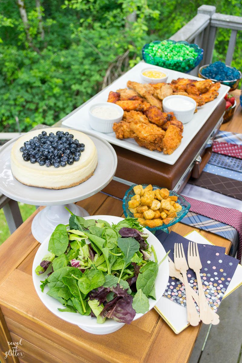 First, every party menu should start with the guest of honor’s favorite food…in our case, chicken wings! What I love is they are a. not just for game day b. can be easily customized and c. hold up well. It is easy to place a quick order from your favorite wing spot and pick up a few dressings while you are at the grocery store.
