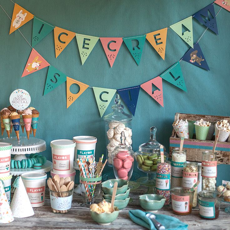 I scream, you scream…how about a ice-cream sundae buffet? Families can bring a quart of their favorite ice-cream, brownies, cookies, whipped cream, the works! Make sure to have lots of ice-filled coolers to keep everything cool, unless ice-cream soup is one of your creations. This lovely set up from Lia Griffith comes with free printables.