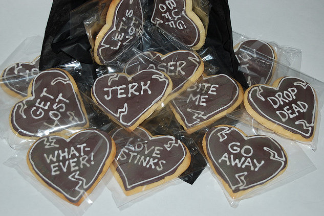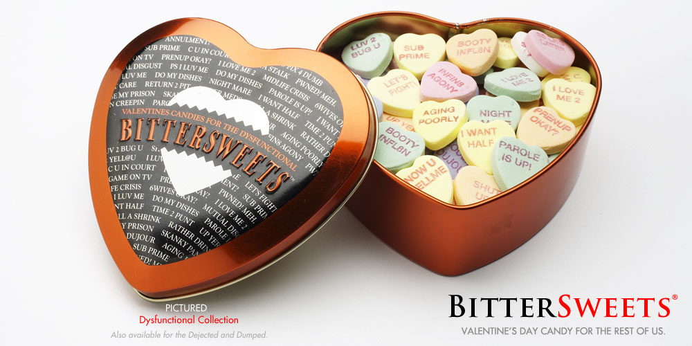 Steepster has great “Forget Him” tea packs that will go great with that cup of bile your gals are drinking. But what has got to be my favorite is the bitterness that reigns supreme over at Despair.com with their BitterSweets. They feature three unique collections – “Dejected”, “Dysfunctional”, and “Dumped”. Candies are printed with such lovely gems as U LEFT SEATUP, BACK 2 KENNEL, and CELIB8 THX2U.