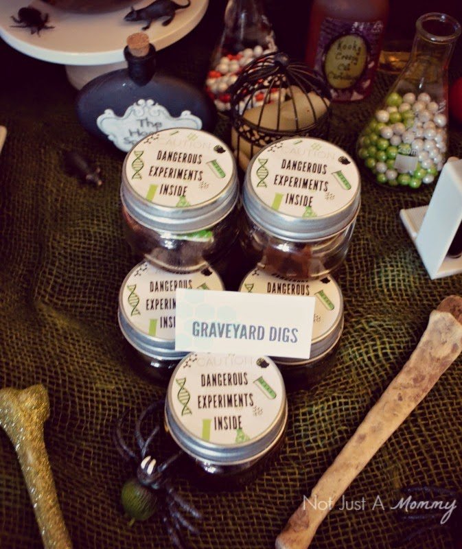 - It’s still a kids’ party so keep the food fun and simple. ย Renaming food never, ever gets old. Ever. Green Cheetos puffs become ‘Particle Puffs’; ‘Graveyard Digs’ are jars of brownie pieces covered with syrup and topped off with a gummy snake.
