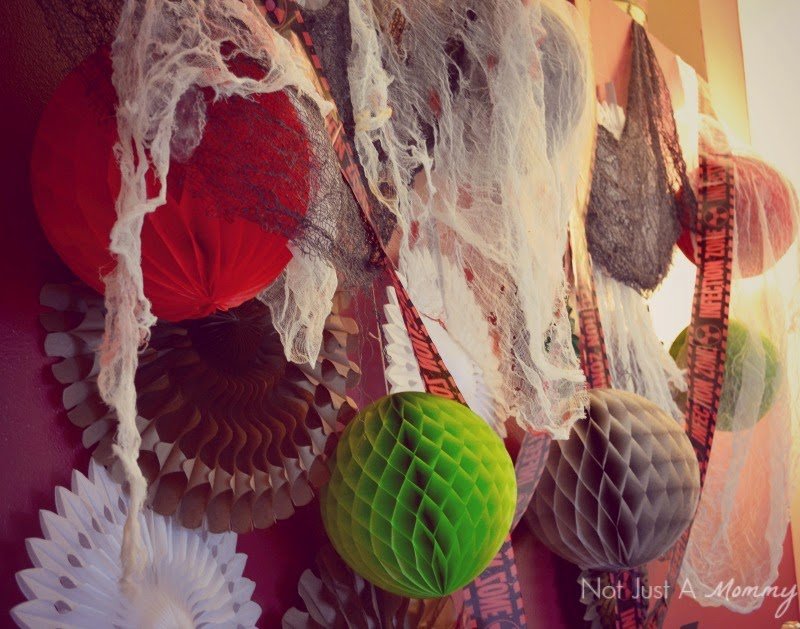 - I never tire of my tissue decor…layering fans and poms with inexpensive cheesecloth, shredded cloth and party tape from Dollar Tree makes the perfectly spooky backdrop.