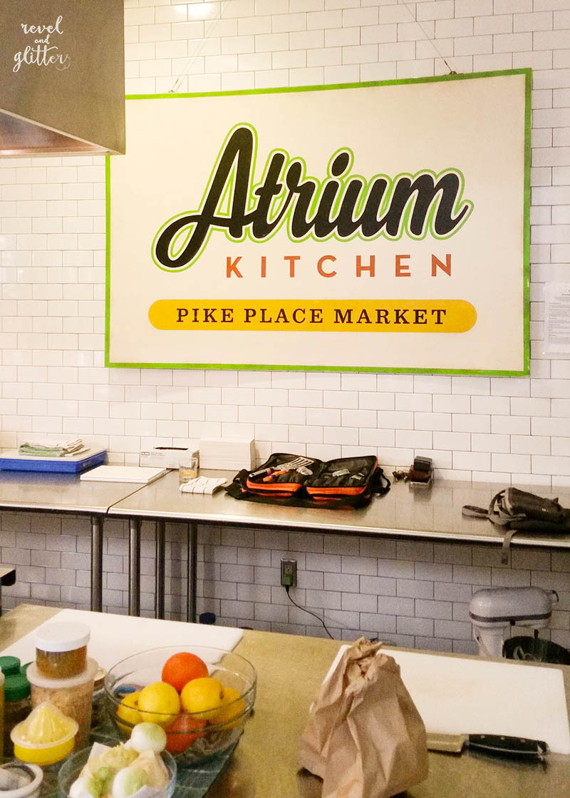 We all met at the the beautiful Atrium Kitchen in the Pike Place Market. ย Which I didn’t even know existed, in a building I’ve never been in. ย And I’ve lived and been coming to the market for over 13 years. The learning has already begun. ย Eat Seattle’s cooking classes consists of a tour through the market where Chef Liz and Chef Jay Midwood explained the local and seasonal produce they selected as the ingredients for our menu.
