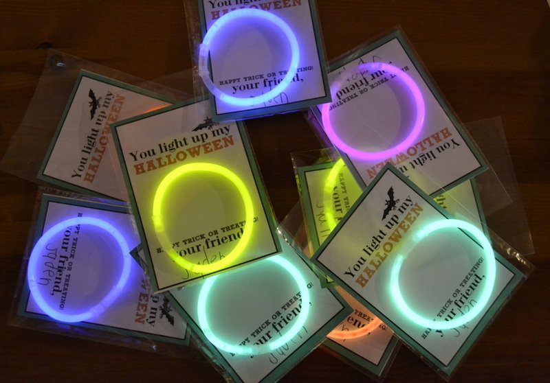 Hope you have a rocking Halloween this year and be safe out there trick-or-treating! Here’s what the boy is passing out in class today, a clever non-candy idea I found from that clever girl Mique from 30 Handmade Days at Eighteen25….free printables + Dollar Tree GID bracelets is cleverness indeed!