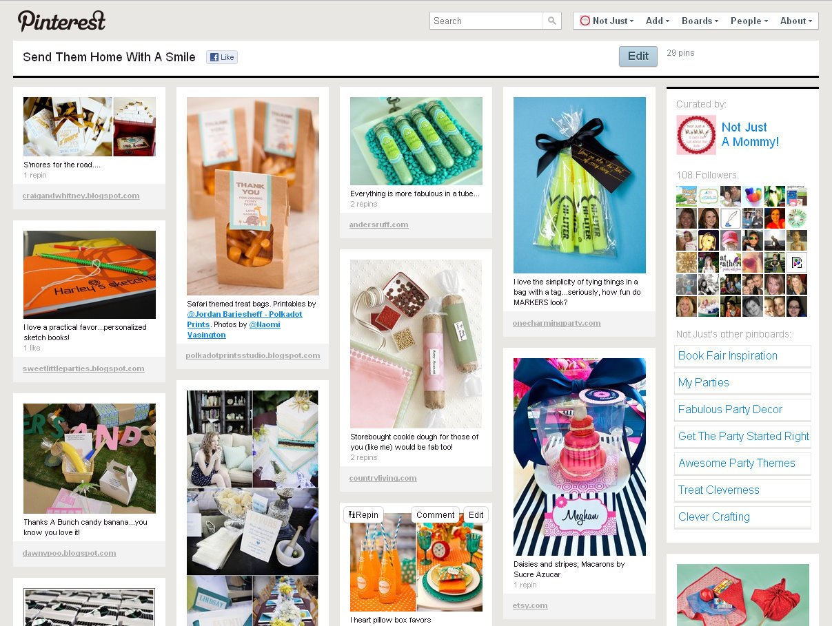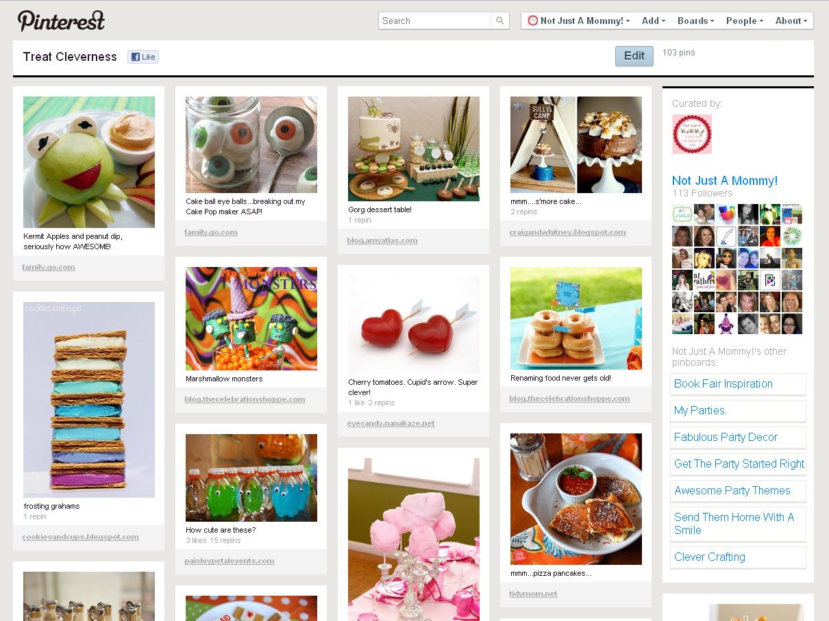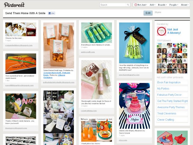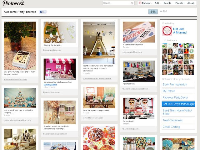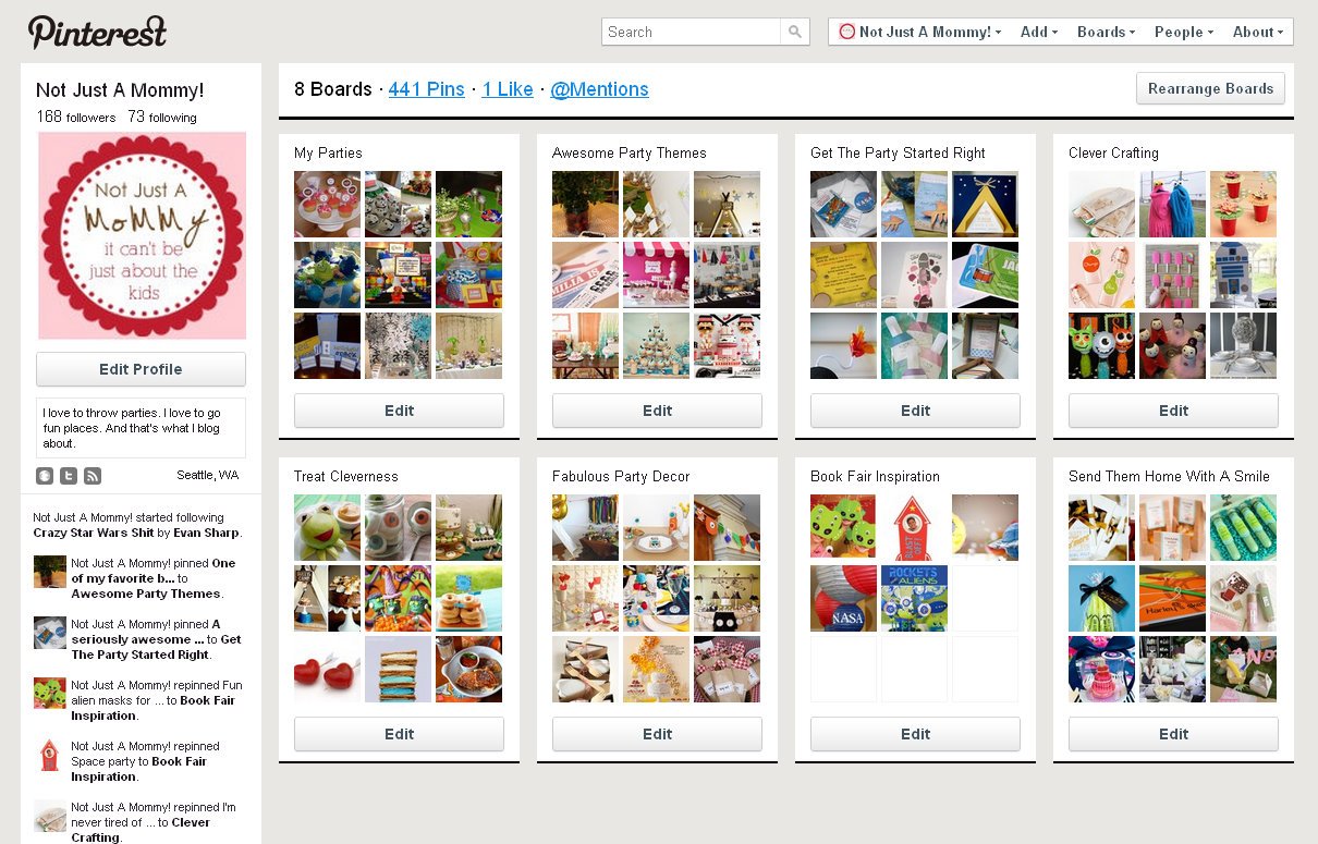 For example, my boards are all things party pretty. ย I’ve (so far) 8 boards, like ‘Awesome Party Themes‘ (self-explanatory)…’My Parties‘ (of course)…