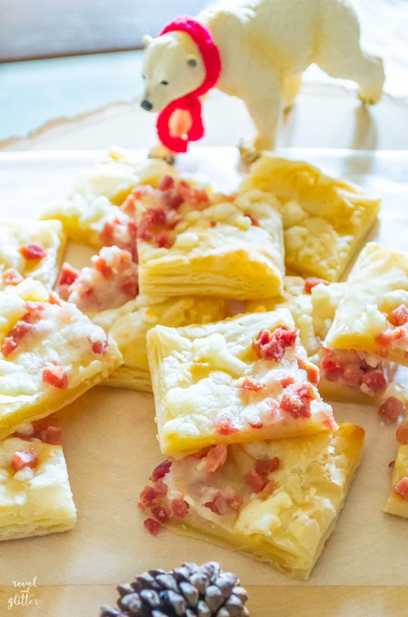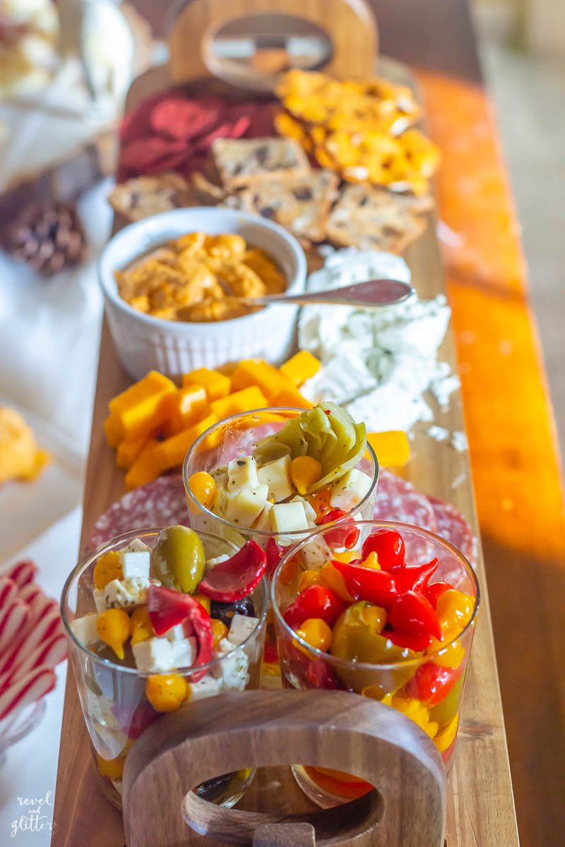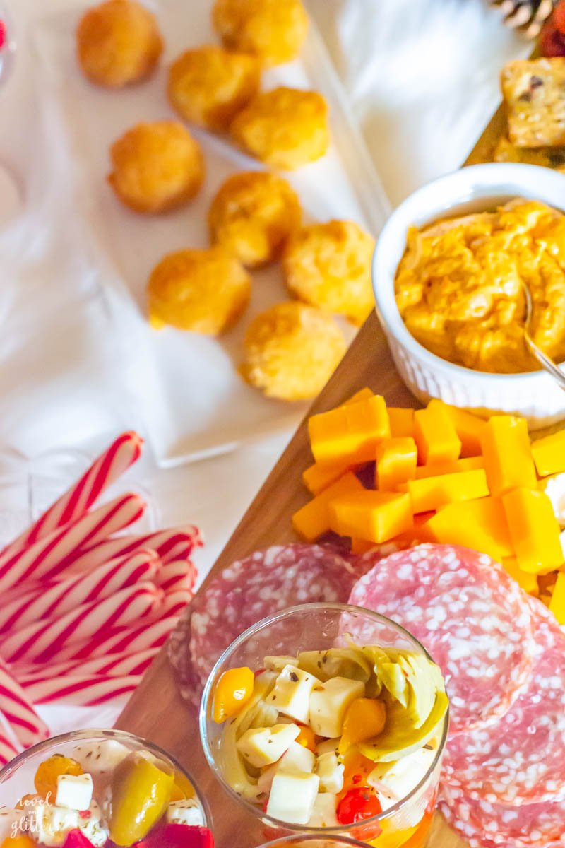 - Instead of sandwiches, a ham and cheese croissant bar is served up in bite sized portions. Also in manageable portions, mac and cheese bites! This makes it easy for guests who want to nibble and talk before having to head back out into the holiday madness.