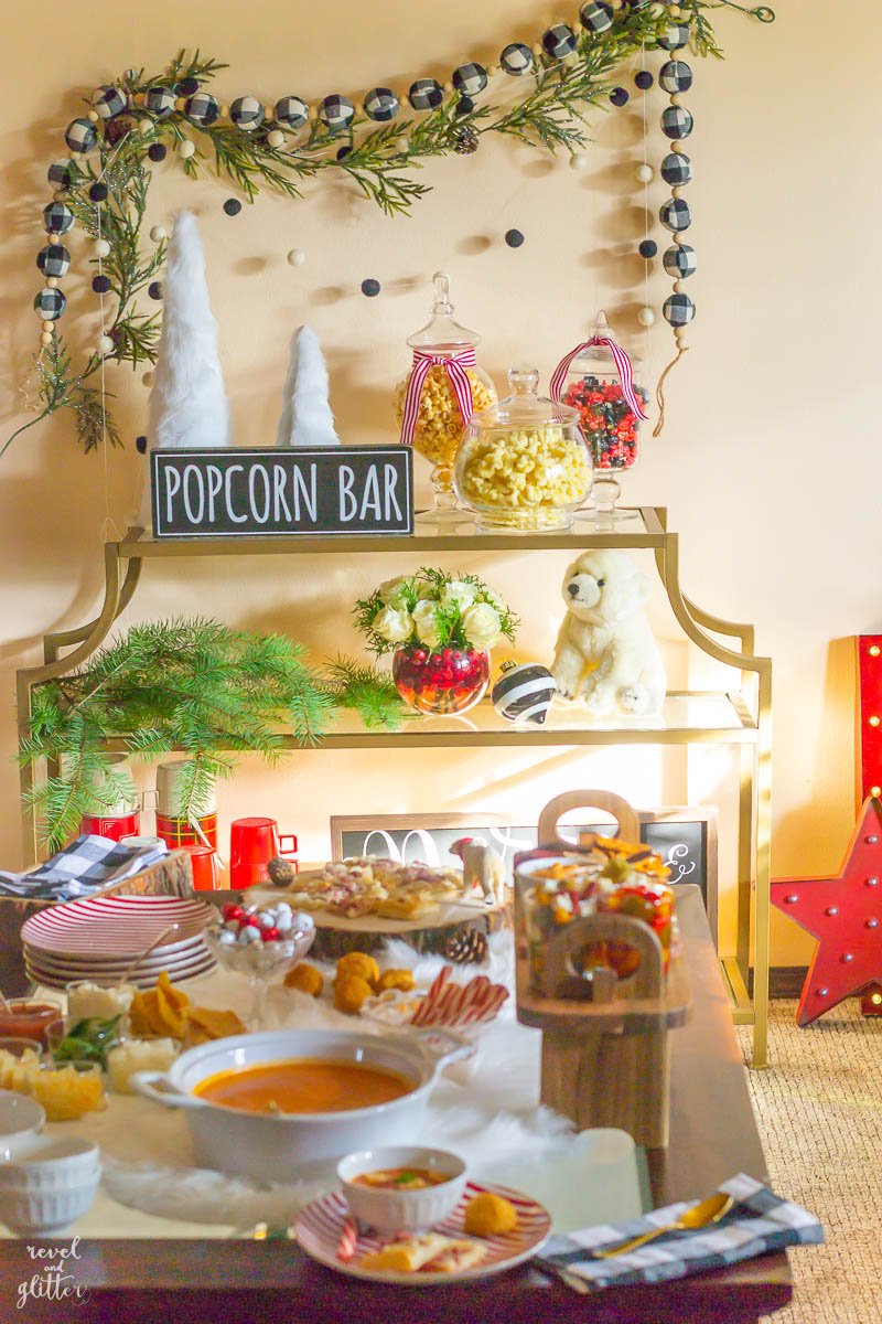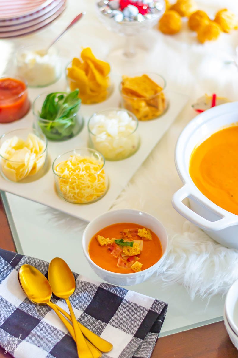 Our menu is all about the comfort food! We did a twist on the classic tomato soup/grilled cheese combo with a tasty tomato bisque with a toppings bar and other store-bought appetizers.