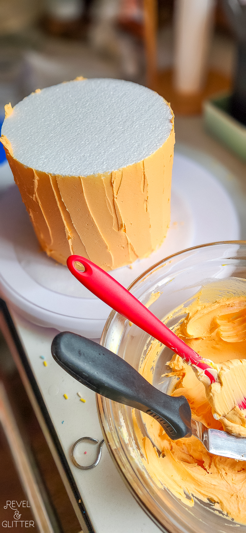 - Break out your offset spatula and start frosting the cake dummies. It is perfect for keeping your knuckles out of the frosting and a better angle for applying.