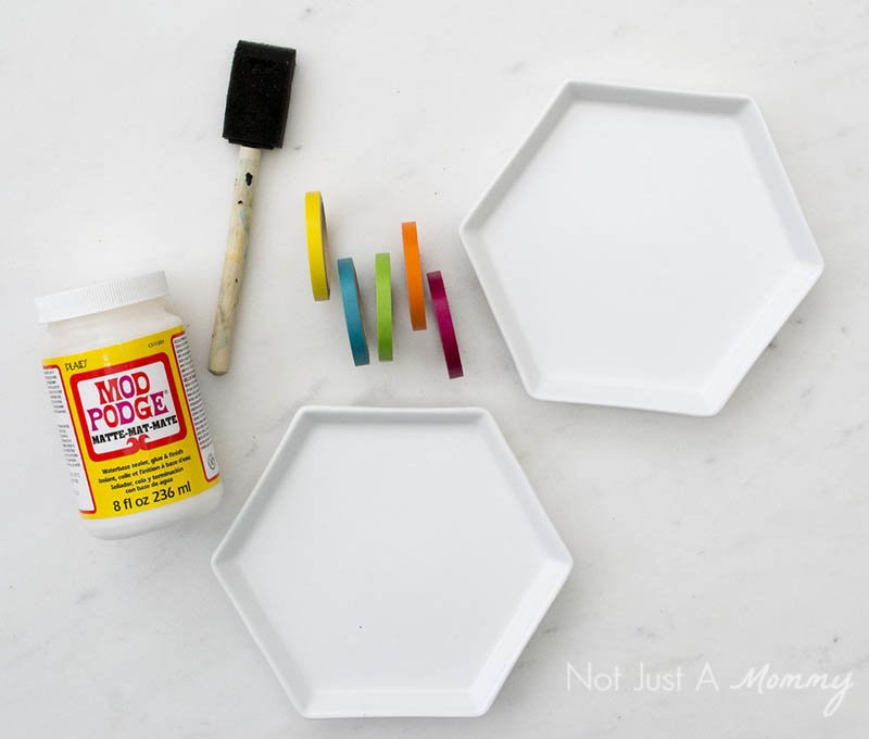 I stumbled across these unfinished ceramic hexagonal trays in the kids’ crafts section of Target and mentally did a happy dance! ย Pinterest is running rampant with these trays, copycats of more expensive versions with gold leaf, painted, decoupaged, the works.
