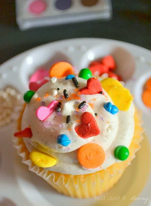 I loved the idea of using (new and clean) paint palettes for young artists to create artwork with their cupcake. ย Yes, I do have a ridiculous amount of sprinkles. But when you have kids coming to your house on a revolving-door basis, you better have stuff on hand to keep them busy and decorating anything with sprinkles holds the crazy at bay.