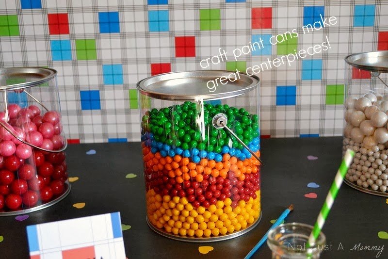 Putting together a tablescape can be easy with a little cleverness and even less money. ย A stop to Michaels or your favorite craft store will yield almost everything here…craft paint buckets, mini easels and water color paints, plastic paint palettes and brushes. I set the scene with black butcher paper and heart stickers…see, there is some Valentine stuff here.