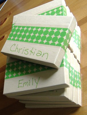 Thankfully we’ll be secretly passing these out at school and hand-delivering the rest. I’m so in love with the green bubble masking tape that I found in Michael’s dollar section(!!!). Even cooler because Washi tape is the latest in packaging, but alas, it is a bit pricey! My boxes, a score from Packaging Specialties.