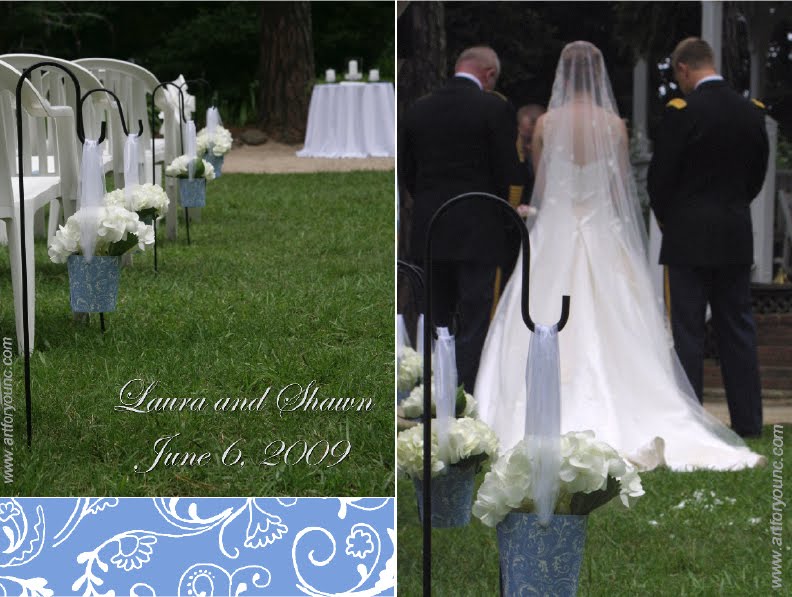 Years ago, my mother invented a pew clip to hang bows and flowers from wedding aisles. The idea was one minute the flower pots were aisle decorations, the next centerpieces and favors thus saving brides money and being eco-friendly. As a graphic designer, I couldnโt help but give the plain pots a face lift and adapt them to hang with ribbon for outdoor weddings and โ voilร โ faux vases that hang anywhere!