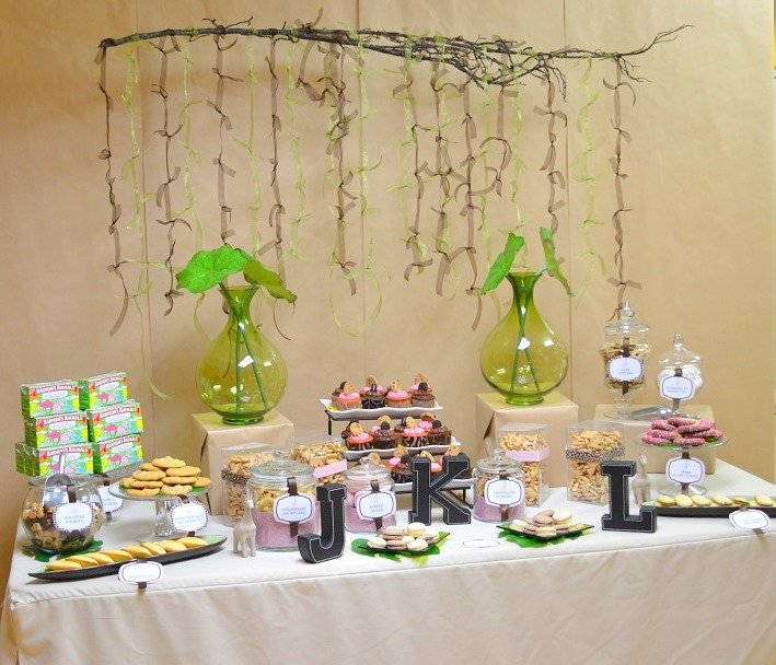 The focal point can be above the table like the branch at my Pink Safari baby shower. It doesn’t compete with the oversized vases for attention, even though at first they may seem to be the first thing you see, the branch is visually more interesting since your eyes travel up the ribbon.