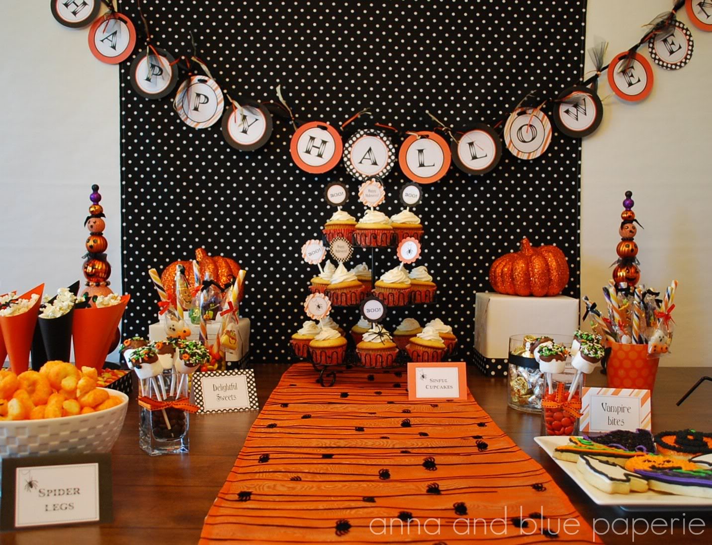 Size doesn’t always matter. On a regular, horizontal table, the cupcakes onย thisย Halloween tableย from Anna And Blue Paperieย could have easily been lost. ย Because they are set so far back, it becomes the table’s main focus.