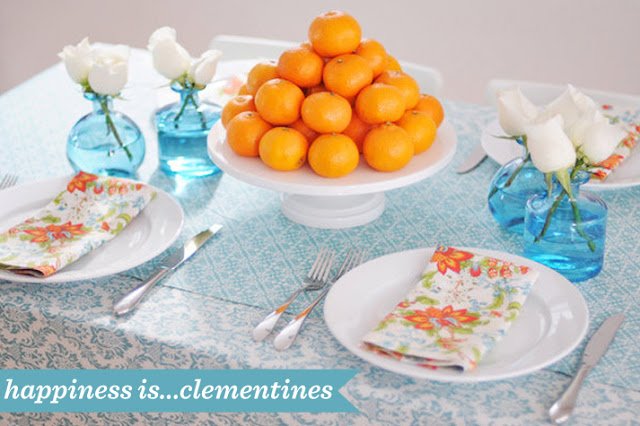 The stand of clementines is the clear focal point of this table from Brunch At Saks, but it doesn’t scream it…the contrast between the soft aqua tablecloth is perfect.