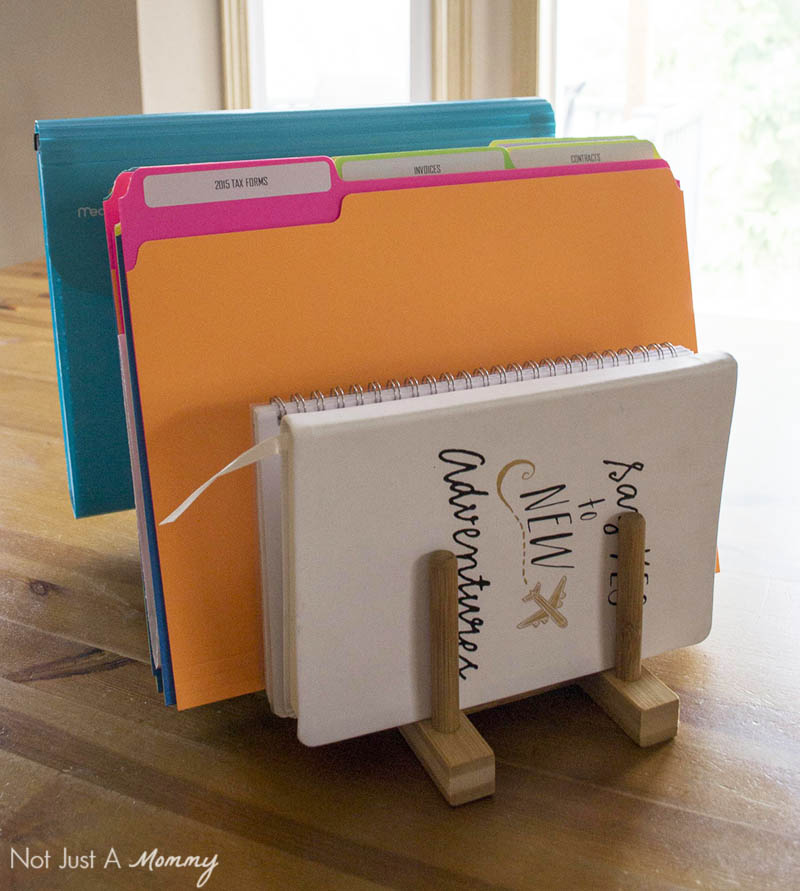 If you like my more stylish option of folder storage…it’s a bamboo dish display rack! Yes, just like the ones you see in stores displaying their…wait for it…dishes. The slots are wider than your typical holder, so it can also hold my notebooks and editorial calendar in addition to my folders, keeping all my business doodads in order.