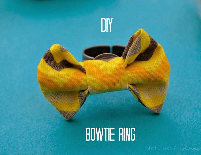 Remember my no-sew bowties? ย I modified them just a bit and turned them into rings. I picked up ring bases from Michael’s and made the bowties from 4″ squares of material. ย Then, I hot glued them on…I know, that easy!