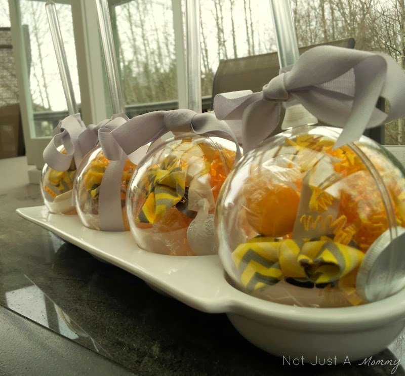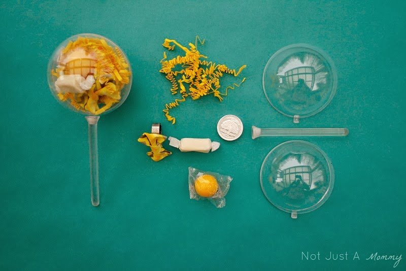Party Lollis come in three pieces, so you easily fill the dome halves, line them up and screw the handle on…how ingenious is that? ย I was surprised at the quality of the plastic when they first arrived, they are a made of a nice acrylic. ย I couldn’t wait to fill them with tissue shred, some candy, and oh yeah, a bowtie ring!