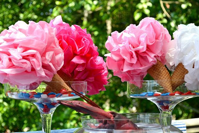 What is awesome about it is very wallet-friendly…most of the items were from around the house…scrapbook paper liners, the tablerunner is actually two pillowcases, and how easy is making tissue poms and hotgluing the remaining ice cream cones to them?