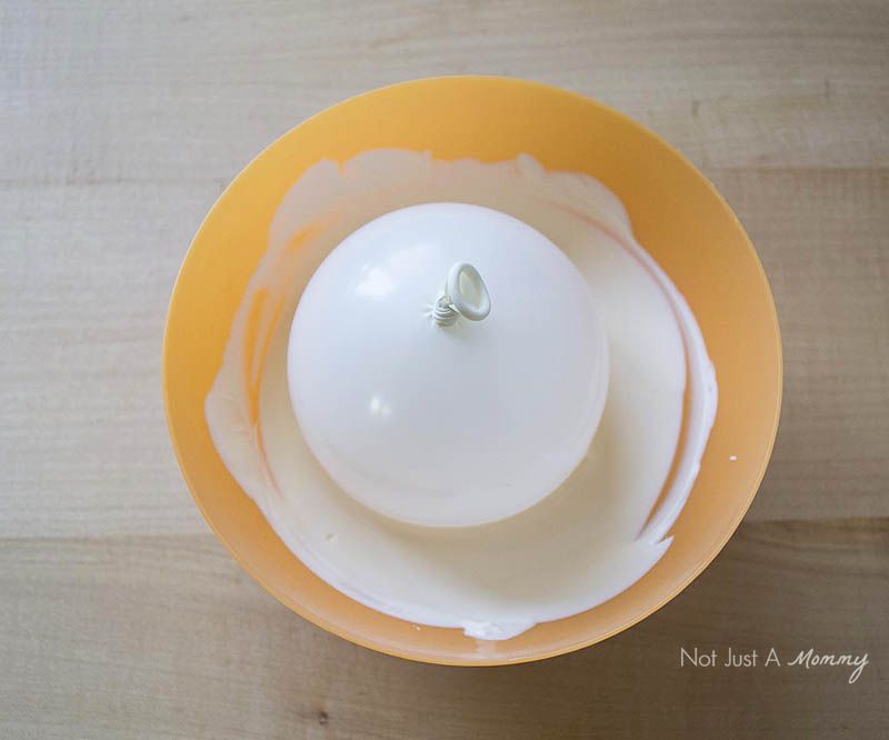 3. While the melt is still smooth and slightly warm, hold a balloon by the knot and dip it in the melt until it comes halfway up the sides of the balloon. Rotate so the sides are evenly coated.