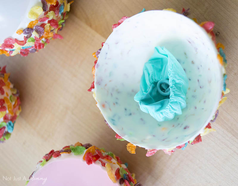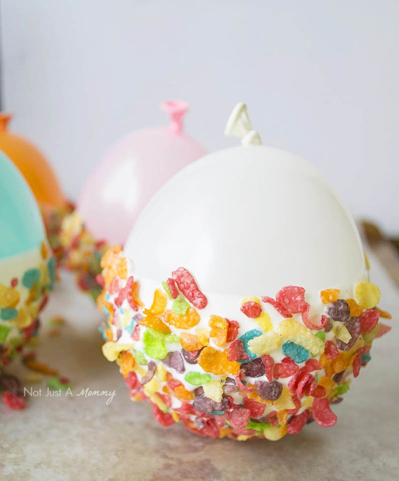 I’ve made edible balloon bowls before, and to take it to the next level, I dipped them in cereal! Oh yes, an edible candy bowl made with Fruity Pebbles.
