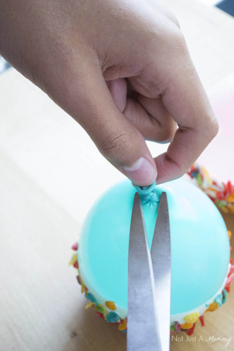 I’ve made edible balloon bowls before, and to take it to the next level, I dipped them in cereal! Oh yes, an edible candy bowl made with Fruity Pebbles.