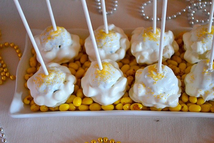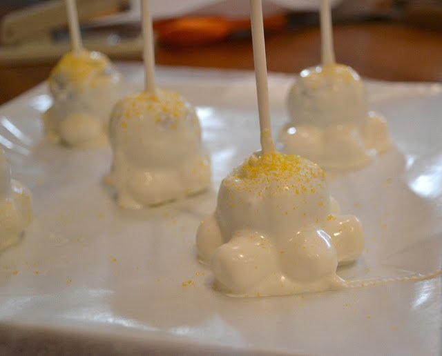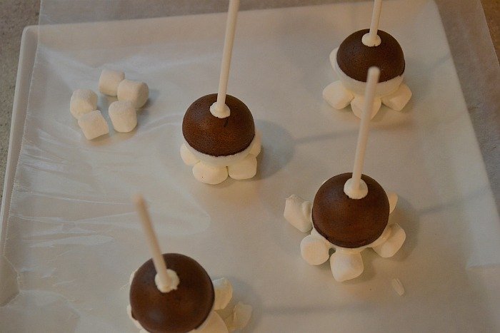 Then I dipped half the cake pop into the white candy melt, then set on a little bed of mini marshmallows.