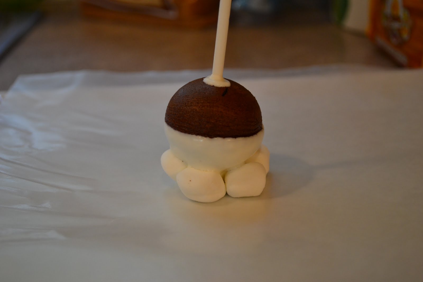 The moment I stuck the ball into the candy melts, the weight dragged the marshmallows off. Oh, and the bumpy texture glares right through. The vision in my head went poof. Seriously, poof.