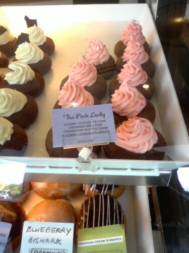 Yup, I ordered the Pink Lady, a moist chocolate cake doughnut with a huge dollop of pink strawberry buttercream and sprinkled with pink sanding sugar. All evolved doughnuts are served in a lovely plastic container. Clever, no?