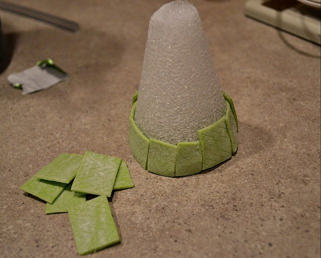 I made the trees by layering 5 Gumยฎ in juicy green on a styrofoam cone with a red Skittle topper.