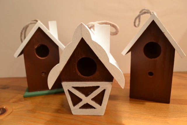 I started with unpainted birdhouses, then added a coat of brown paint and white for the roofs….